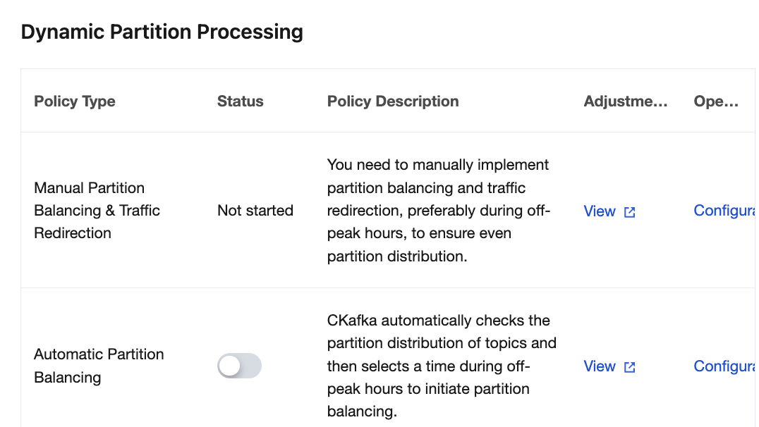5. Click Configuration in the Operation column of Automatic Partition Balancing to set an automatic partition balancing policy.