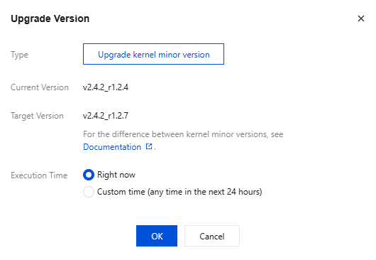 Target Version: The instance is upgraded to the latest broker version by default. The system automatically detects the minor version. If Minor Version Upgrade cannot be selected, it indicates that the instance is already the latest minor version. For differences between kernel minor versions, see Broker Version Upgrade Records. Execution Time: You can select Right now or Custom Time (any time within the next 24 hours). It is recommended to perform the operation during off-peak hours.