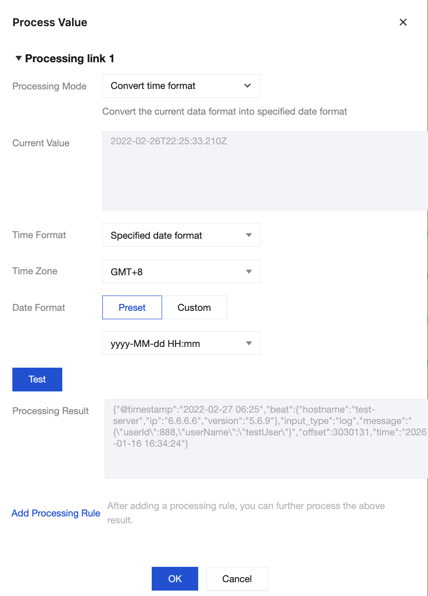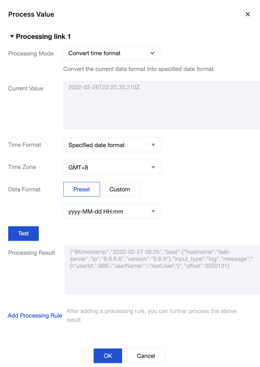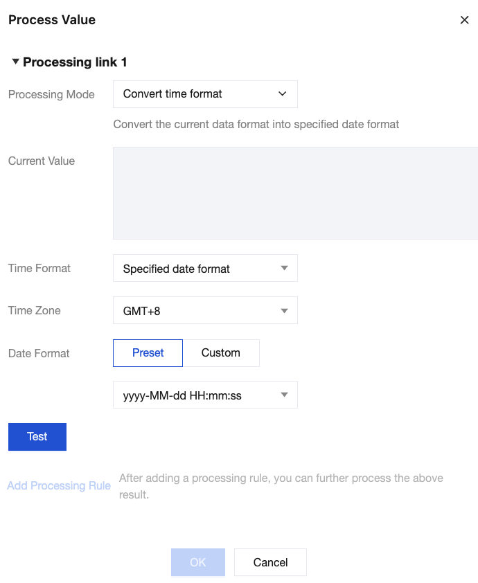 Select Convert Time Format for the processing mode, select the time format, time zone, and date format, and then click OK.