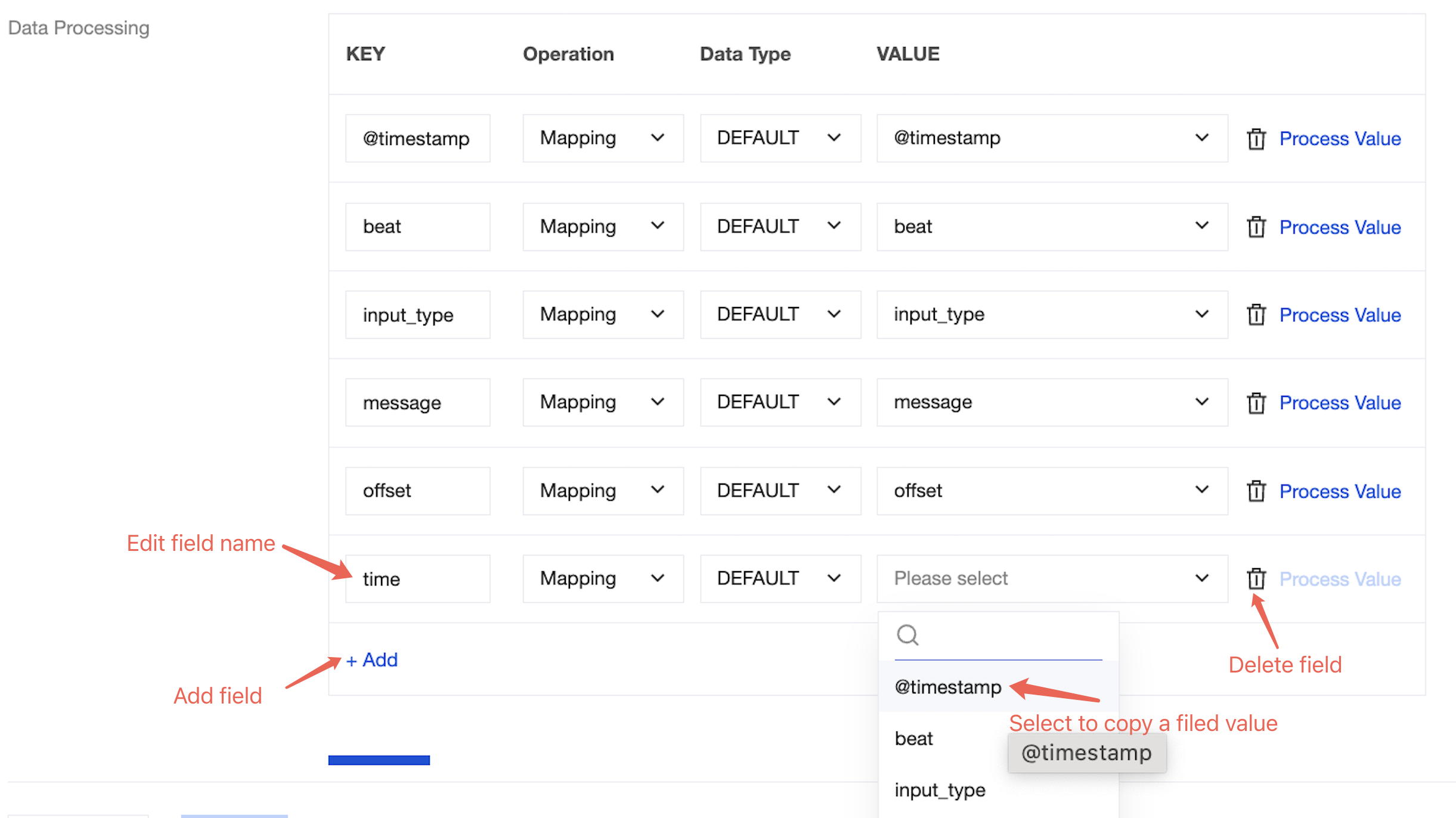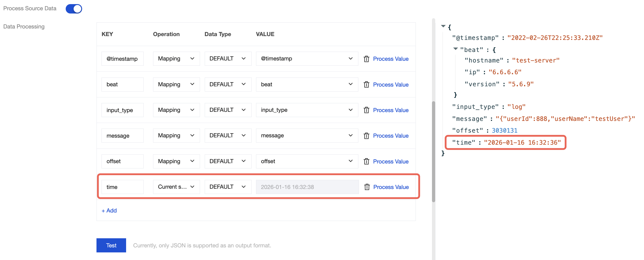 1.5 Edit and delete fields, adjust the timestamp format, and add a field for the current system time.
