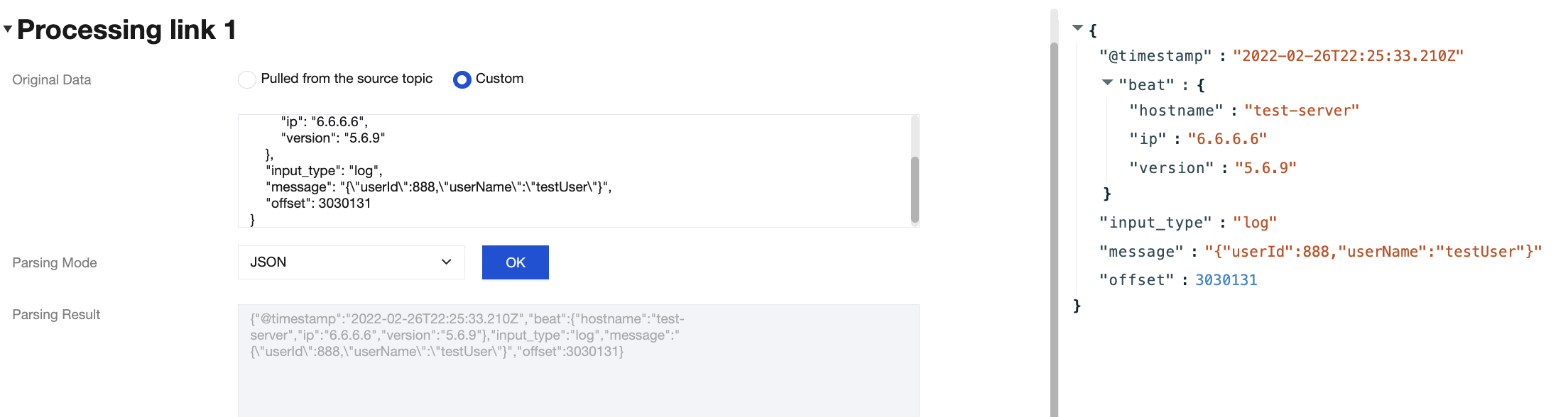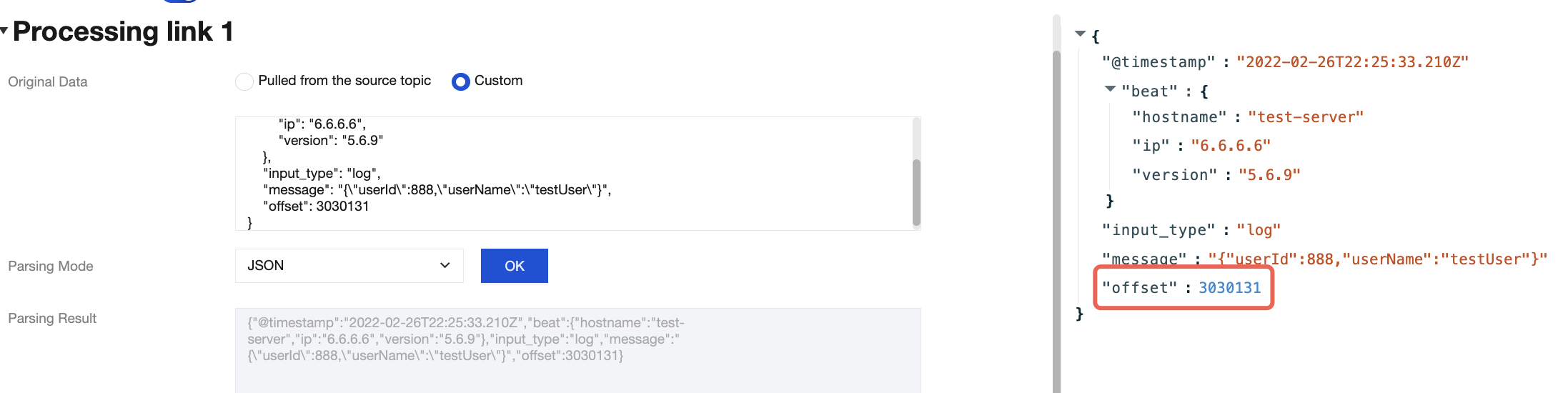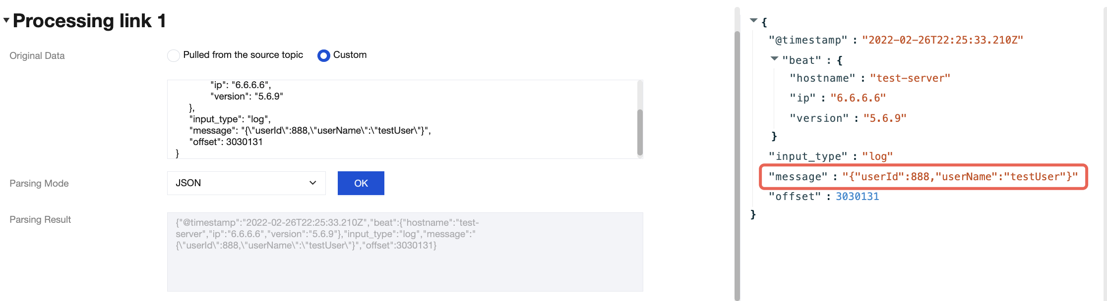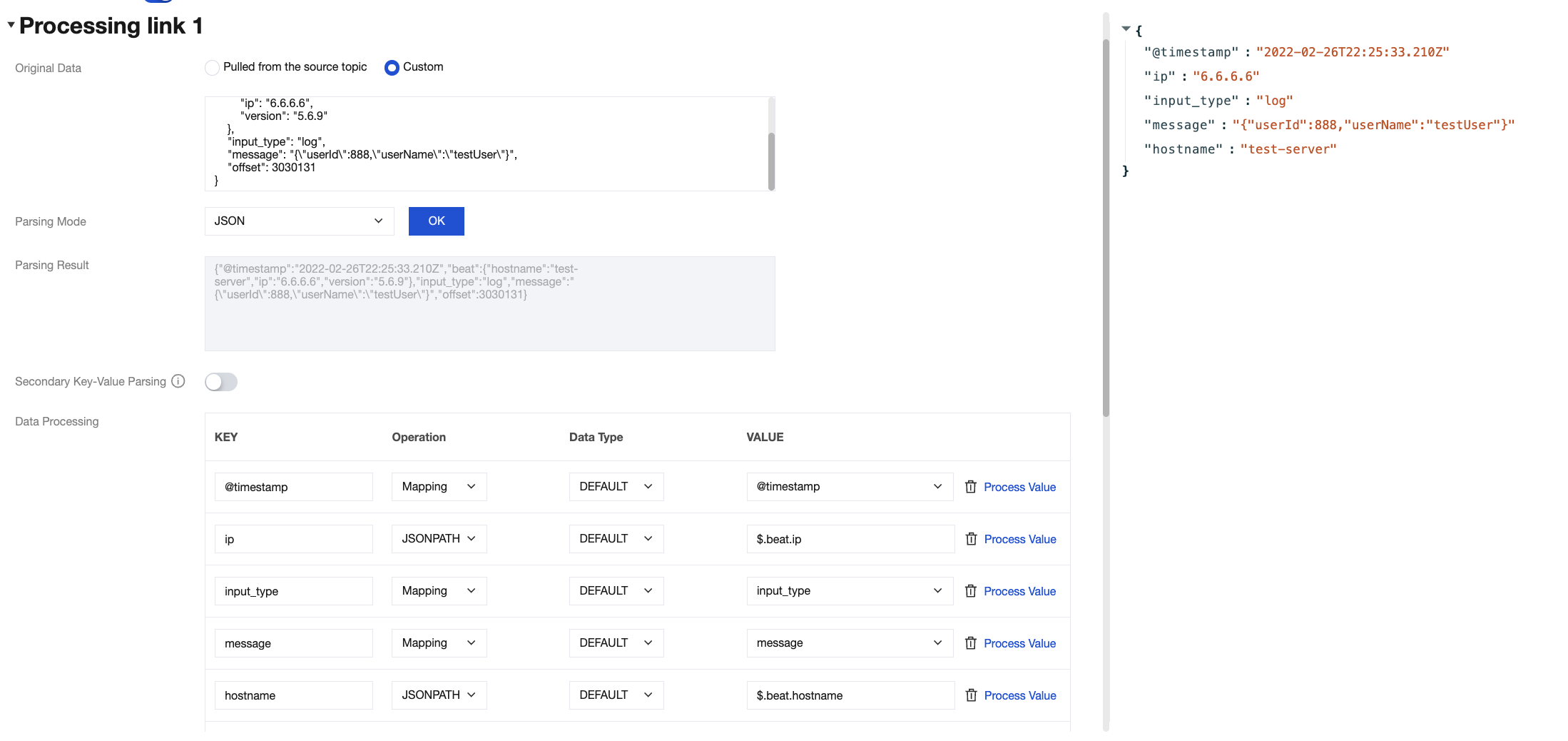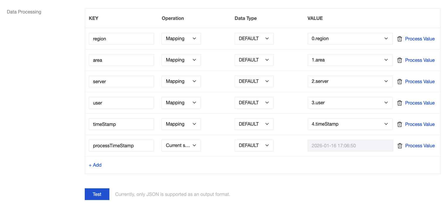 During data processing with the CKafka connector, you can use various methods to edit and modify the parsed data fields to obtain your desired data. For example: