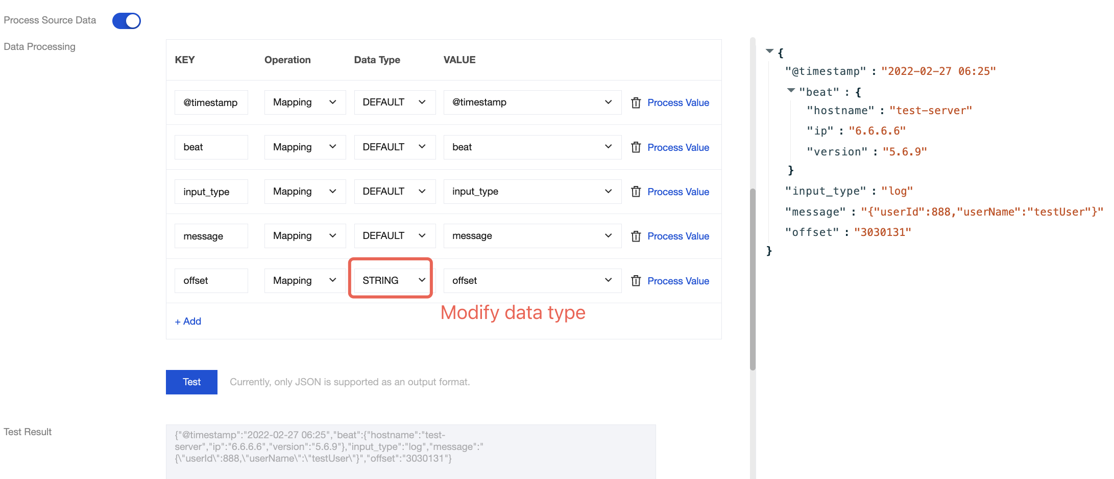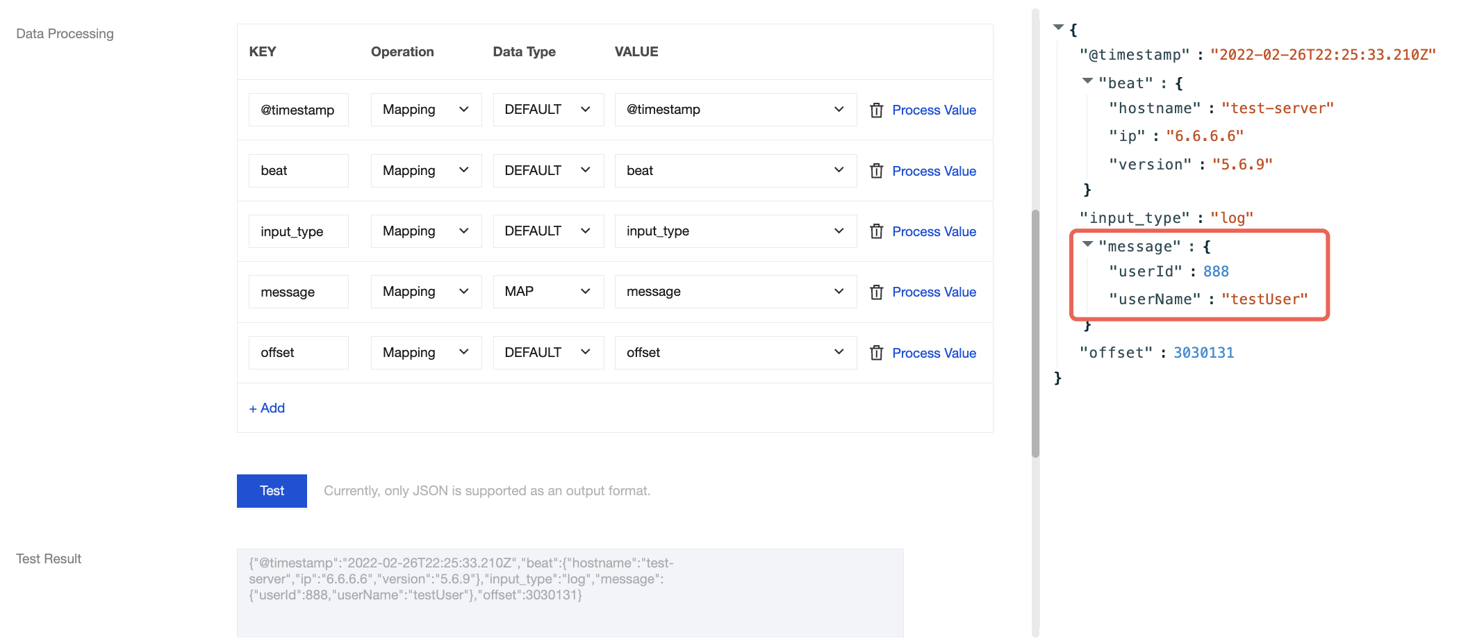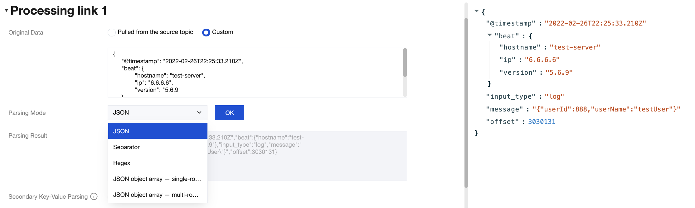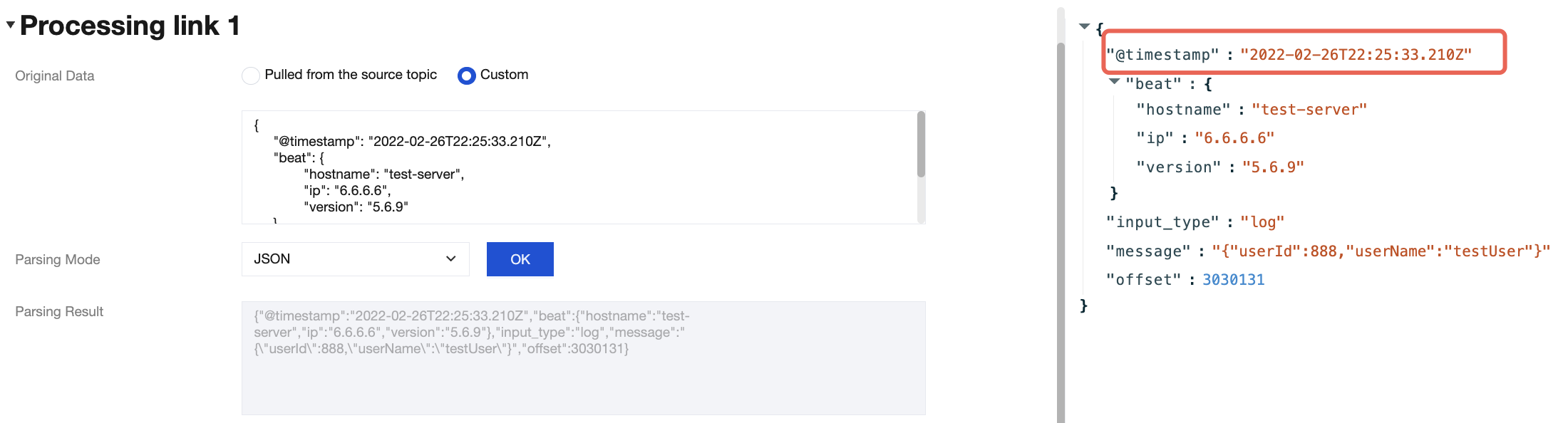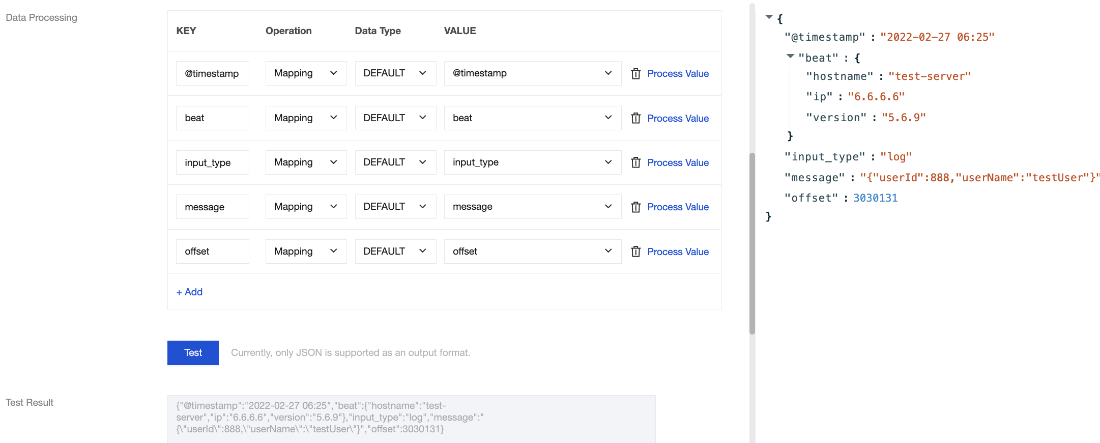 During data processing with the CKafka connector, you can use various methods to edit and modify the parsed data fields to obtain your desired data. For example: