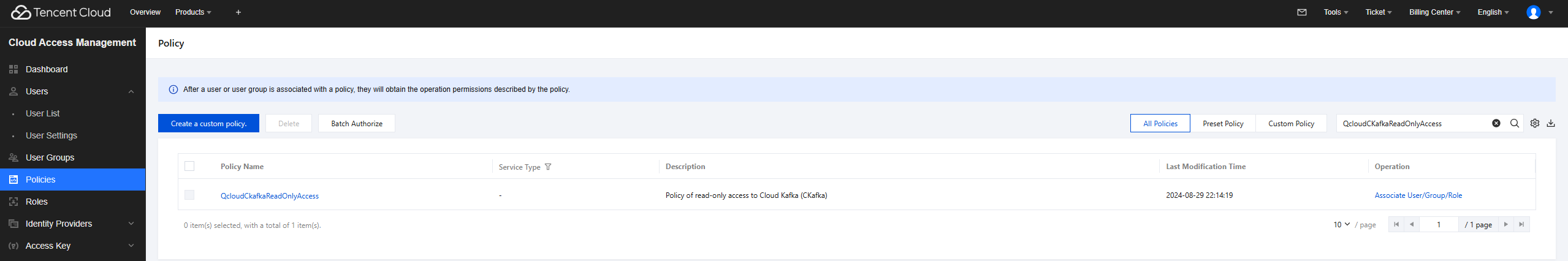 2. Select Policy in the left sidebar to go to the policy management page, Search for QcloudCKafkaReadOnlyAccess on the right.
