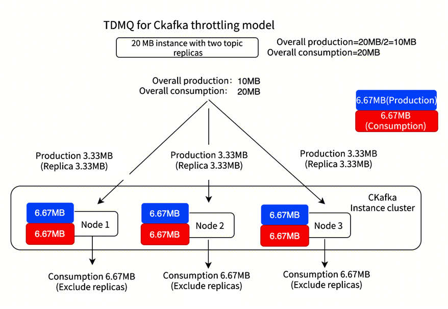 Customers can configure traffic throttling for a topic. For example, they may configure Topic:Test with 2 replicas, write throttling at 7 MB/s (including replicas), and consumption traffic throttling at 20 MB/s.