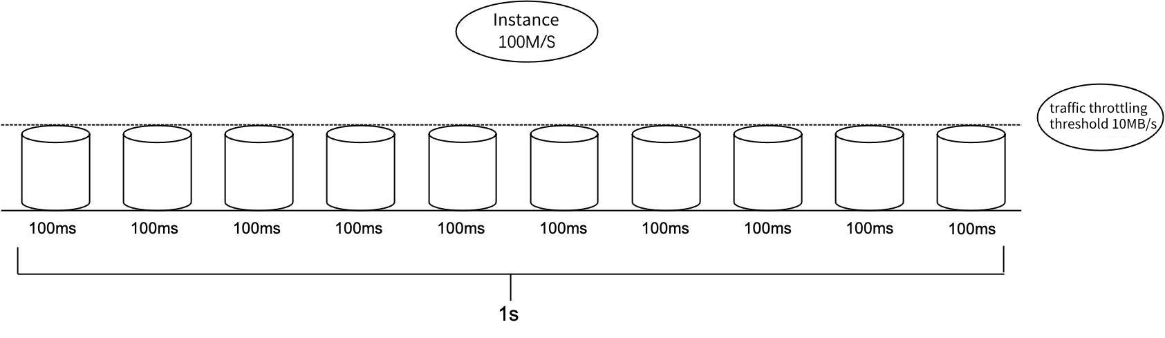 The traffic throttling policy evenly divides each second (1000 ms) into multiple time buckets. For example, if each second is divided into 10 time buckets, the time of each bucket is 100 ms. The traffic throttling threshold for each time bucket is 1/10 of the total instance specification speed. If the TCP request traffic in a time bucket exceeds the throttling threshold of that time bucket, the response packet latency of the request will be increased according to the internal traffic throttling algorithm, so that the client cannot quickly receive TCP response packets to achieve the traffic throttling effect within a period of time.