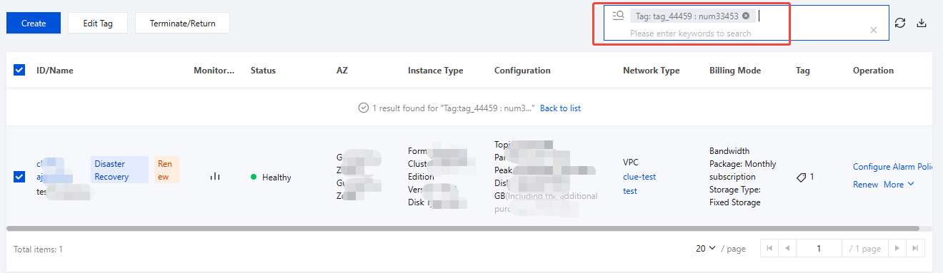 2. In the pop-up window after "Tag:", select the tag you want to search for and click ok to perform search. For example: Select Tag: owner:zhangsan to filter out the cluster bound with tag key owner:zhangsan.