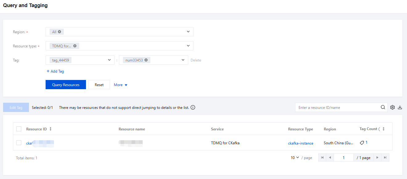 3. Click Query Resource, check the needed resources in the results, click Edit Tag, and you can bulk bind or unbind tags.