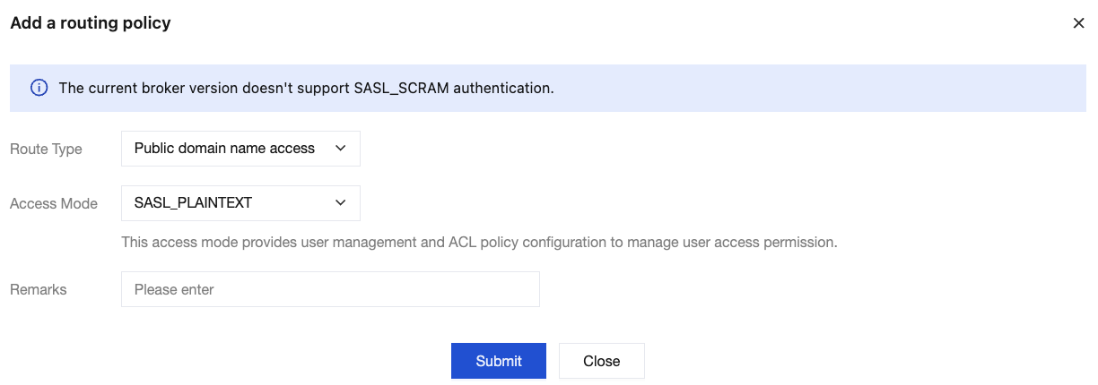 4. In the pop-up window, select Public domain name access as the route type. The access methods of SASL_PLAINTEXT and SASL_SSL are supported. Enter the remarks information.