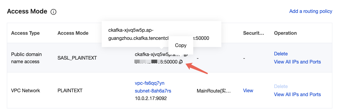 5. Click Submit to complete the creation of the public network route. In the Network column, you can view information about the public network access point for connecting to a cluster for message production and consumption.