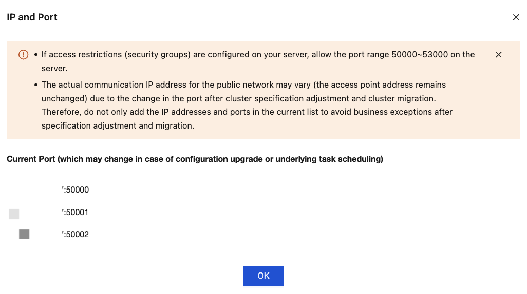 If your server has access restrictions (security group) configured, allow a port range of 50000–53000 on the server. Since ports may change after cluster configuration changes or migrations, and the actual communication IP address of the public network may vary (while the access point address remains unchanged), do not only add the current list of IP addresses and ports to avoid service exceptions after configuration changes or migrations.