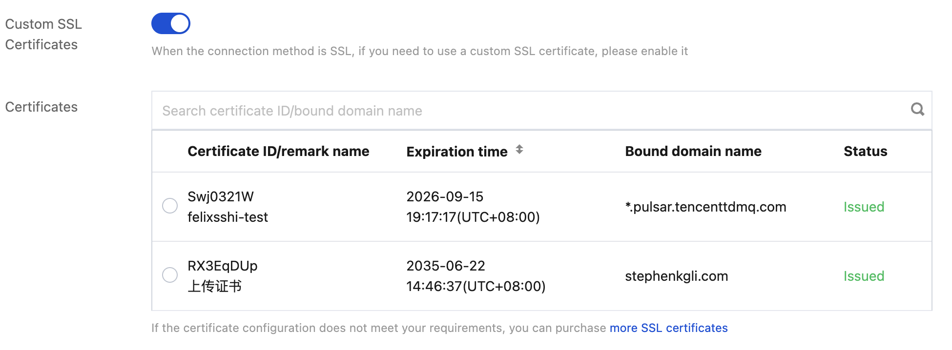 When purchasing a Pro Edition instance, enable Custom SSL Certificate Customization and select the appropriate certificate. You can only select certificates in the Issued status. For specific steps on purchasing a cluster, see Creating an Instance. Step 3: Enabling an SASL_SSL Access Point