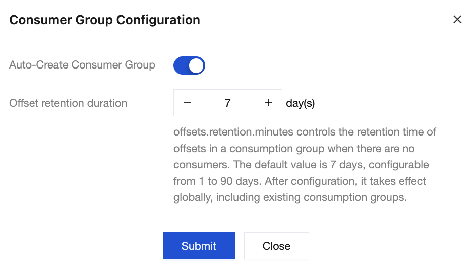 After a consumer group remains in the Empty status (with no members) for more than 7 days, the system will automatically delete it. To enhance the flexibility of resource management, the custom configuration feature in the instance dimension is supported in the TDMQ for CKafka (CKafka) console. This allows users to autonomously set a retention period for empty consumer groups based on business requirements and compliance requirements.