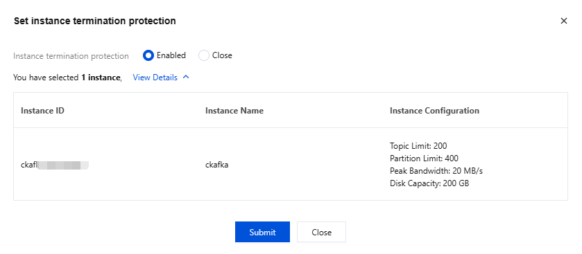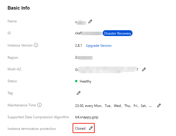 Entry 1: Log in to the TDMQ for CKafka console, click Create in Instance List, and enable instance deletion protection on the purchase page. Entry 2: Log in to the CKafka console, choose More > Set Instance Termination Protection in the Operation column of the target instance in Instance List, and enable instance deletion protection. Entry 3: Log in to the CKafka console, click the ID of the target instance in Instance List to go to the basic instance information page, and enable Instance Termination Protection in the Basic Info module. Disabling Instance Deletion Protection
