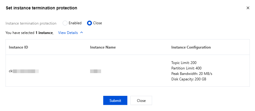 Entry 1: Log in to the CKafka console, choose More > Set Instance Termination Protection in the Operation column of the target instance in Instance List, and disable instance deletion protection. Entry 2: Log in to the CKafka console, click the ID of the target instance in Instance List to go to the basic instance information page, and disable Instance Termination Protection in the Basic Information module.