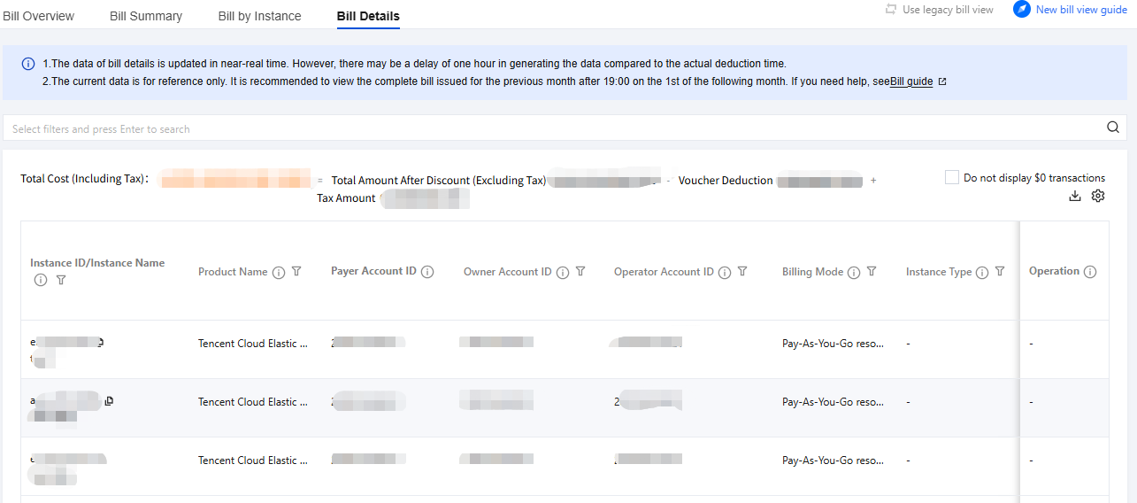 Note: The Resource ID Bill is generated on the 1st of the next month. The data may be delayed, and the query result is for reference only. Please view detailed bill for real-time charge data.