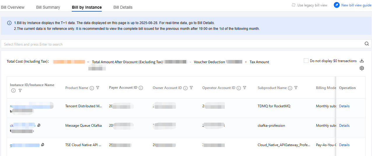 Resource bill: On the bill view page, select the Resource bill tab, choose TDMQ for CKafka under product selection to view consumption details by instance. Click Details in the operation bar to check detailed billing information of the instance.