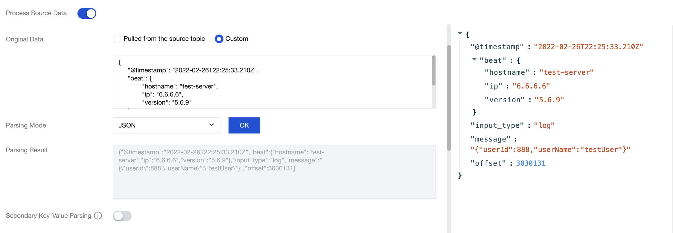 Regex | It is suitable for extracting specific fields from long array-type messages. You can manually enter a regular expression or use the regular expression auto-generation feature. For more information, see Regular Expression Extraction. Note: When the input regular expression contains capture groups such as (?<name>expr) or (?P<name>expr), it is treated as a pattern string for matching. When a message successfully matches the pattern string, the capture group content is parsed. Otherwise, the entire input regular expression is treated as a capture group, extracting all matching content from the message. |