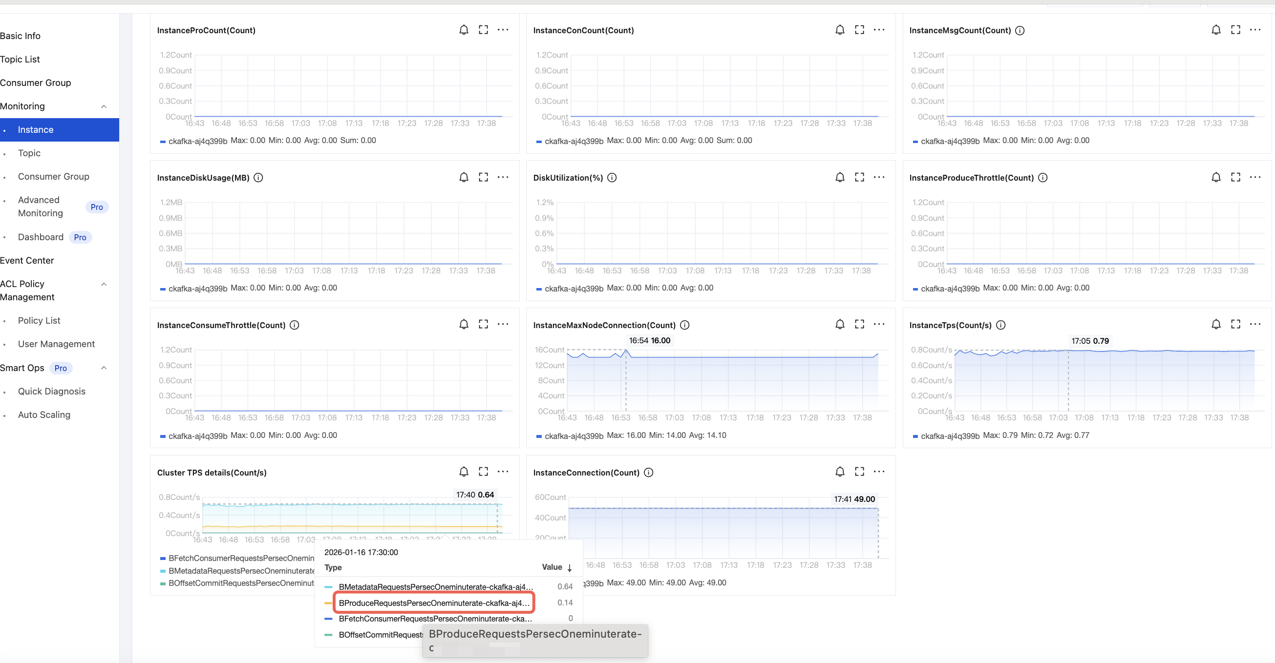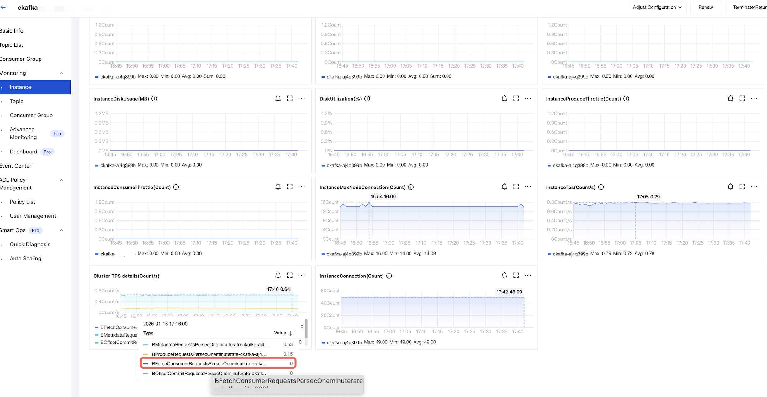 name: KafkadriverClass: io.openmessaging.benchmark.driver.kafka.KafkaBenchmarkDriverreplicationFactor: 2reset: falseuseMyTopic: truetopics: topic_1,topic_2,topic_3,topic_4,topic_5,topic_6,topic_7,topic_8,topic_9,topic_10 #Match the names of the 10 topics actually created.useSharedConsumerGroup: falsetopicConfig: |min.insync.replicas=2commonConfig: |bootstrap.servers= #Access point route.producerConfig: |acks=1compression.type=none #Compression algorithms can be configured as None, GZIP, Snappy, and LZ4, respectively.linger.ms=30000batch.size=32768receive.buffer.bytes = 32768max.request.size=1048576max.in.flight.requests.per.connection=5request.timeout.ms=30000consumerConfig: |auto.offset.reset=latestenable.auto.commit=truereceive.buffer.bytes = 32768max.partition.fetch.bytes = 1048576fetch.max.wait.ms=500max.poll.interval.ms=300000