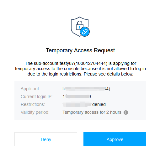 When a sub-account login hits the login IP restriction conditions, if temporary access request is allowed, the sub-account can apply for temporary access, and after the approver approves the request, they will get a two-hour access to the console. 1. When a sub-account login hits the login restrictions, the system will prompt that the sub-account cannot log in temporarily. They can click Send a temporary access request as shown below:
