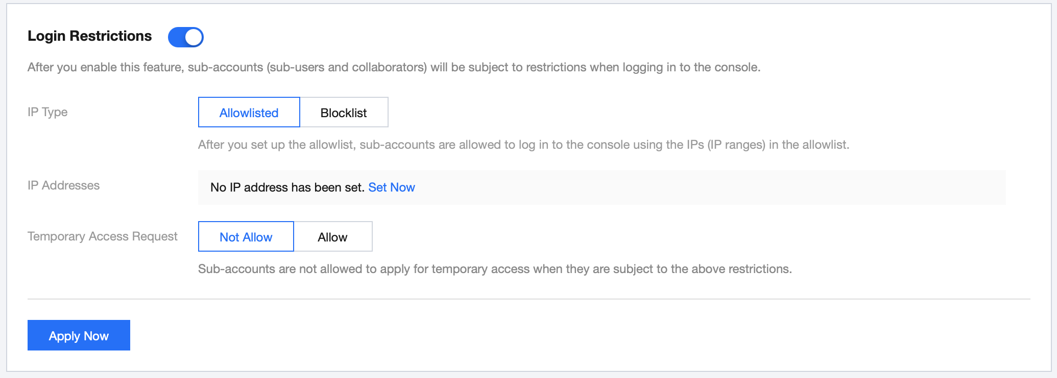 Allow: sub-accounts are allowed to apply for temporary access when they are subject to the above restrictions. The applications will be sent to approvers for review via a valid message channel. If an application is approved, the sub-account will get a two-hour access to the console. If you select Allow, you need to click Set Now to set the approver.