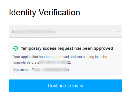 4. If the approver approves the request, the sub-account login UI will prompt that the temporary access request has been approved, and the sub-account can click Continue to log in to get a two-hour access to the console as shown below: