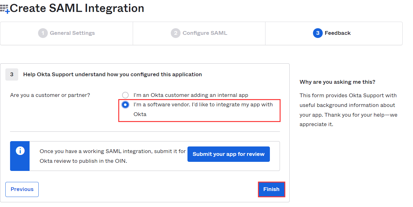 You want to view and download the current user's SAML service provider (SP) metadata file. This file will be used for the subsequent Okta application creation flow and establish the IdP's Trust Relationship with the SP.