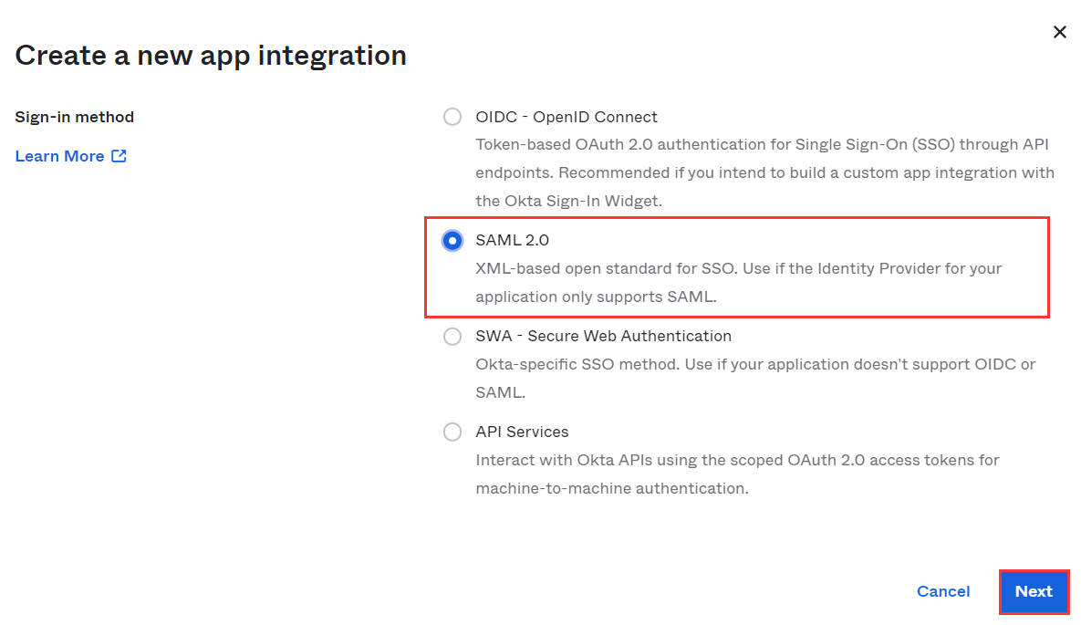 5. In the pop-up Create a New Application Integration window, select Platform and Sign-in method. Among them, set Sign-in method to SAML 2.0, then click Next, as shown below: