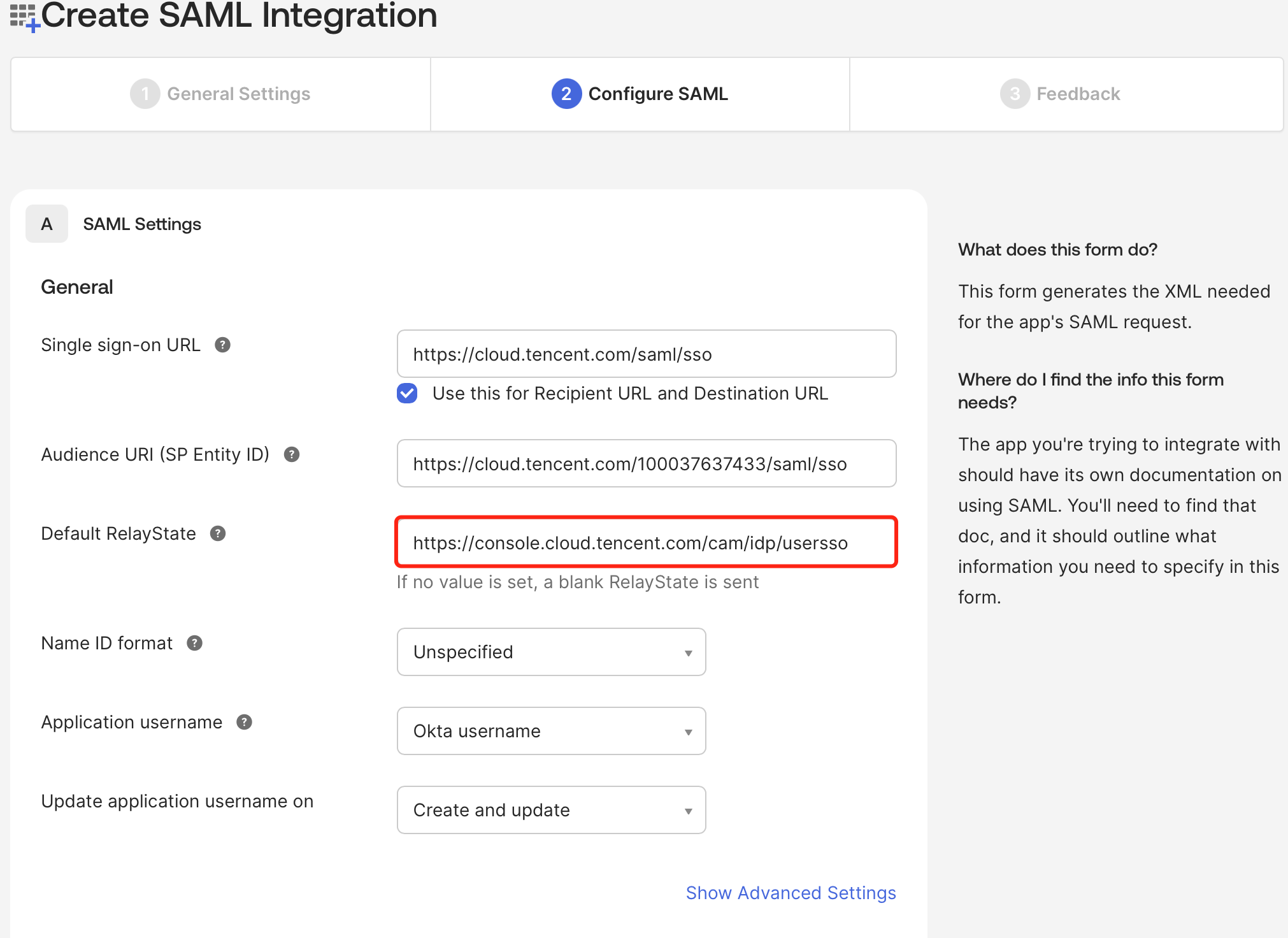 2. If you want to specify a specific page to go to Tencent Cloud, you can supplement Default RelayState (optional) with the domain names or IP addresses require specifying.