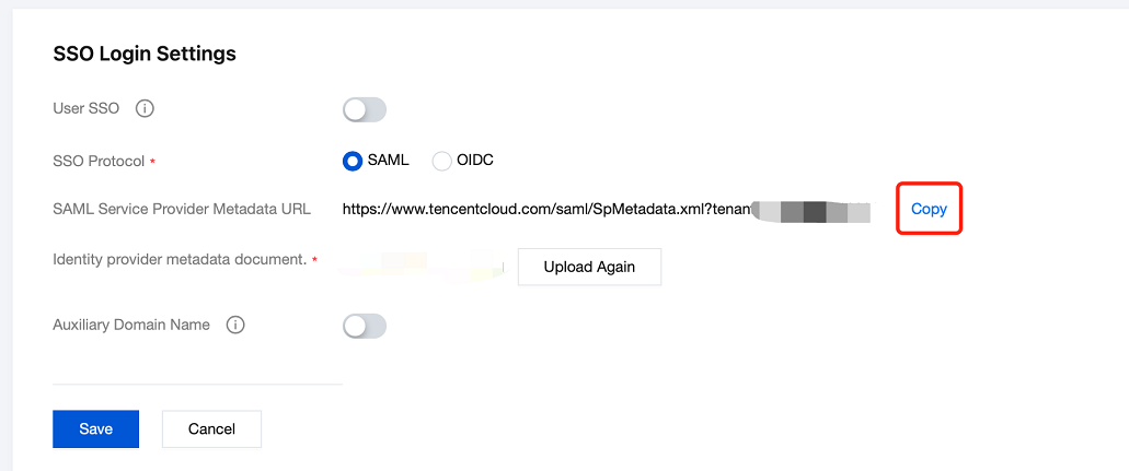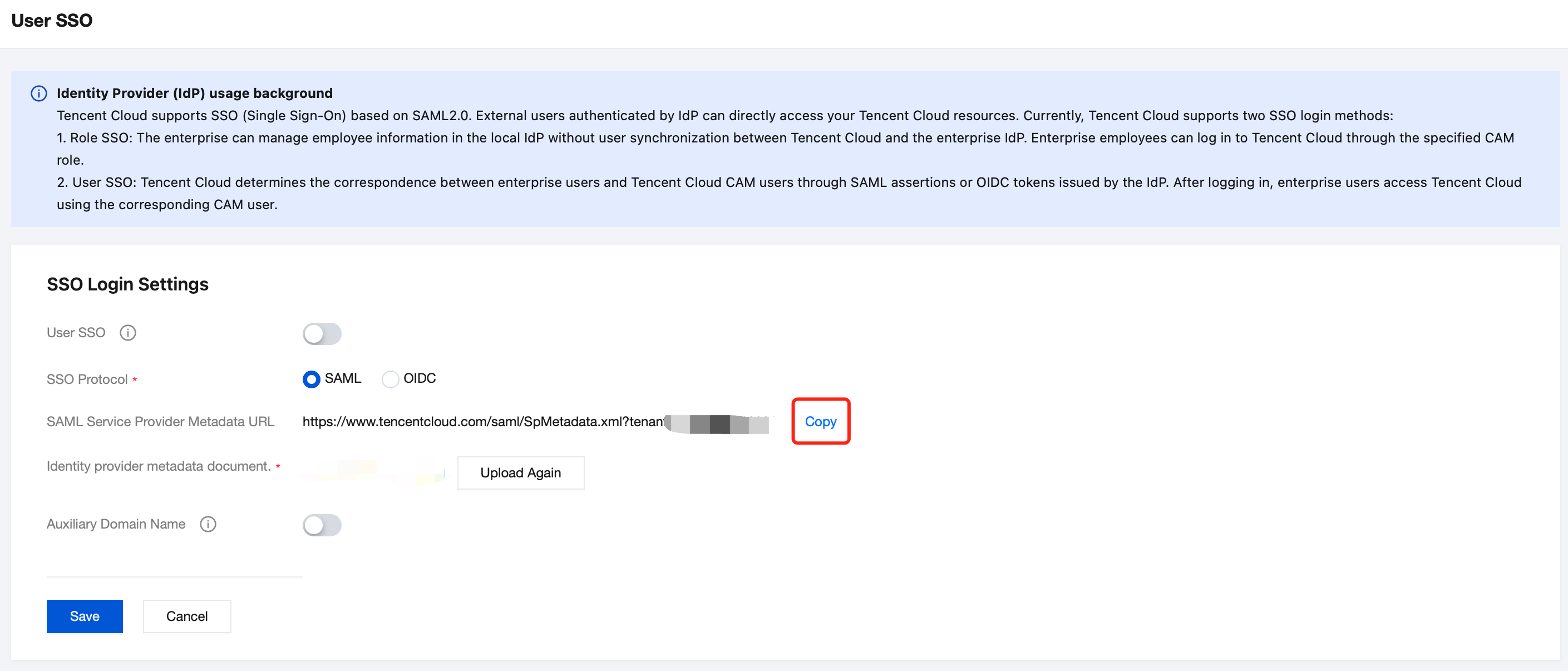 1. Log in to the CAM console, go to Identity Provider > User SSO in the left sidebar, and click Edit. 2. Copy the current user's SAML service provider (SP) metadata URL at SSO login setting.
