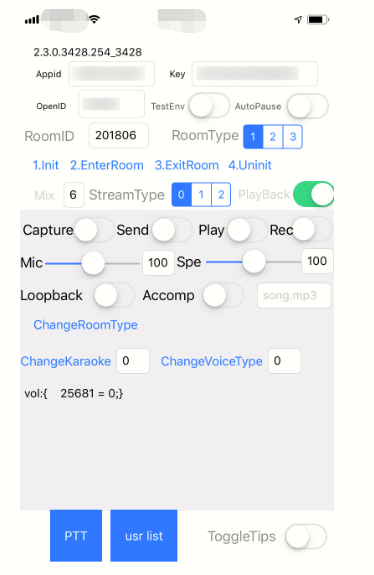 During the test, you can use another device with the same Appid and different OpenID to enter the same room. After enabling the mic and speaker, your two devices can communicate with each other.