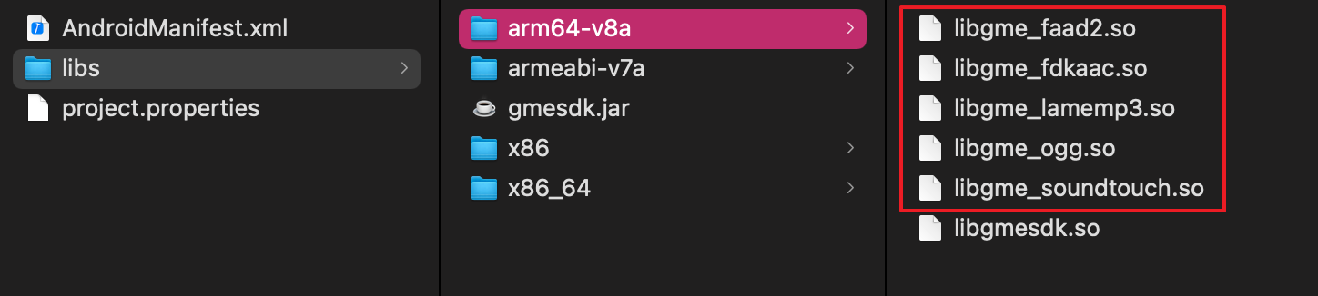 libgme_fdkaac | 1. Used to enter an SD or HD voice room. 2. Used to play back accompaniment files in ACC format |