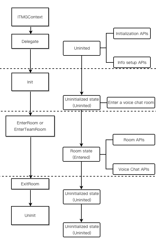 Init API before you can use the voice chat and speech-to-text services.Init API before calling any APIs of GME.API | Description |