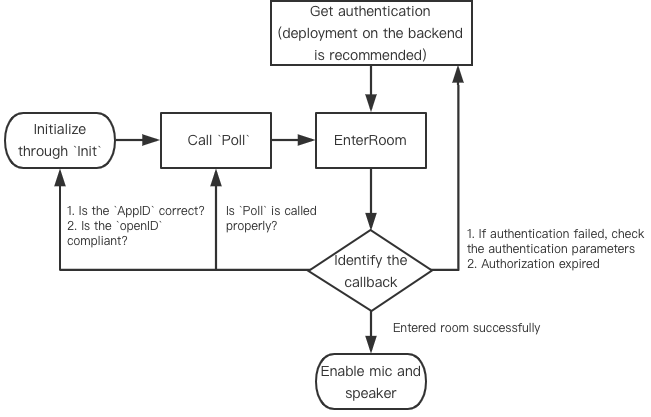 EnterRoom API does not necessarily mean that the room entry is successful.AuthBuffer for encryption and authentication of relevant features. For release in the production environment, please use the backend deployment key as detailed in Authentication Key. @interface QAVAuthBuffer : NSObject+ (NSData*) GenAuthBuffer:(unsigned int)appId roomId:(NSString*)roomId openID:(NSString*)openID key:(NSString*)key;+ @end
