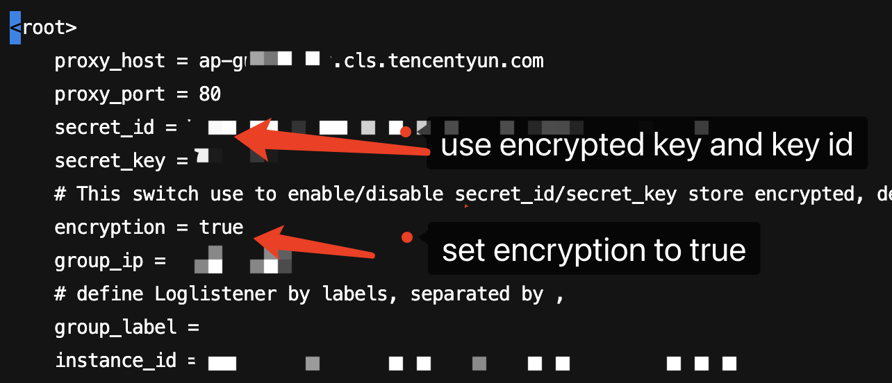 4. Run vim ./etc/loglistener.conf under the LogListener installation path to open the configuration file. Update the secret_id and secret_key fields with the encrypted key ID and key obtained in steps 2 and 3. Finally, set encryption to true.