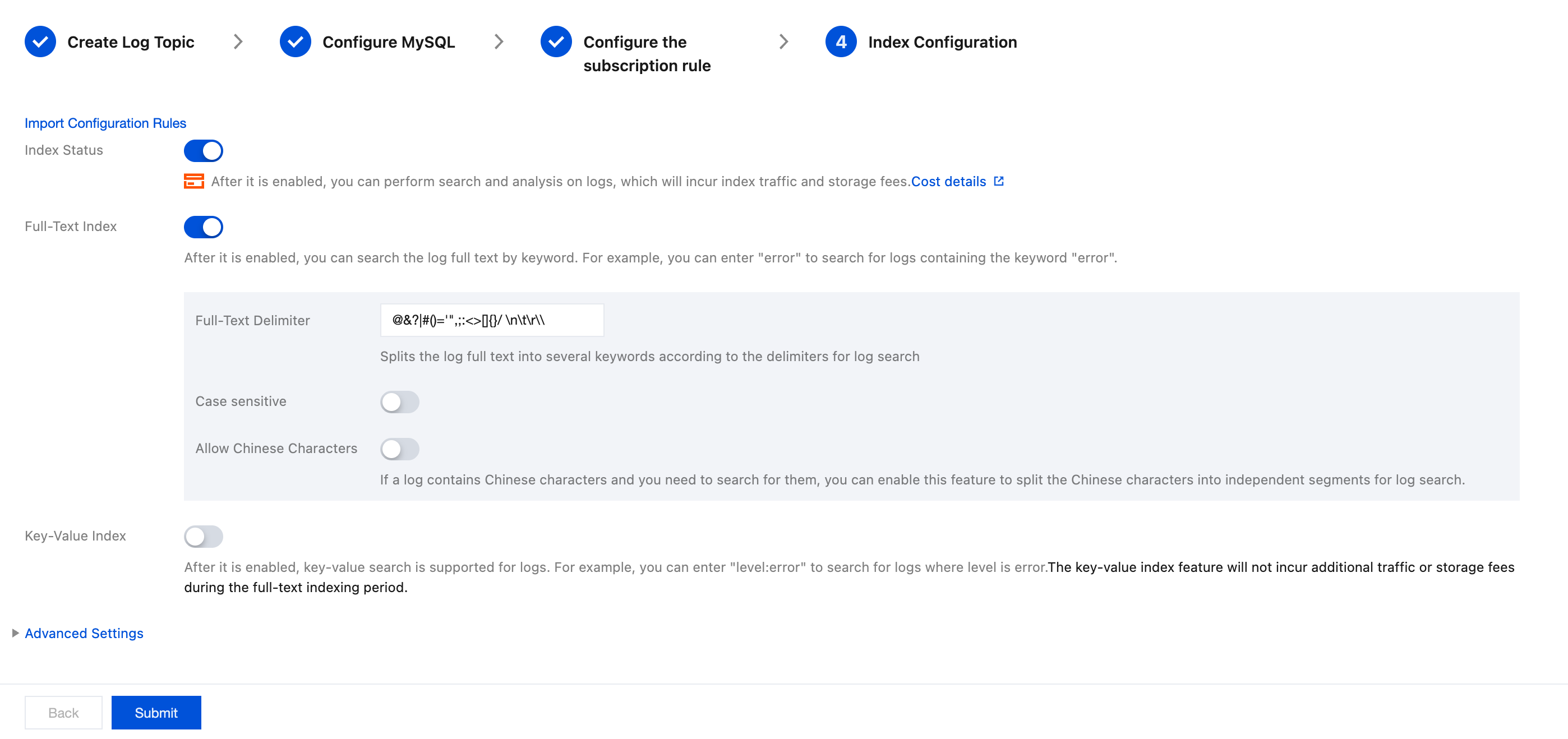 Flatten Event Data | No | If this option is enabled, different events will be split into multiple logs, and operated fields will be tiled in each log. For example, if two database operations are performed, one update to fields a and b, and one update to fields d and e, two logs will be generated with values a:xxx, old_a:xxx, b:xxx, old_b:xxx and d:xxx, old_d:xxx, e:xxx, old_e:xxx respectively. If this option is disabled, event data will be centrally packaged into two fields, old_data and data, in array+JSON format. For example, if two database operations are performed, one update to fields a and b, and one update to fields d and e, the log value will be old_data:[{a:xxx,b:xxx}, {d:xxx,e:xxx}], data:[{a:xxx,b:xxx}, {d:xxx,e:xxx}]. |