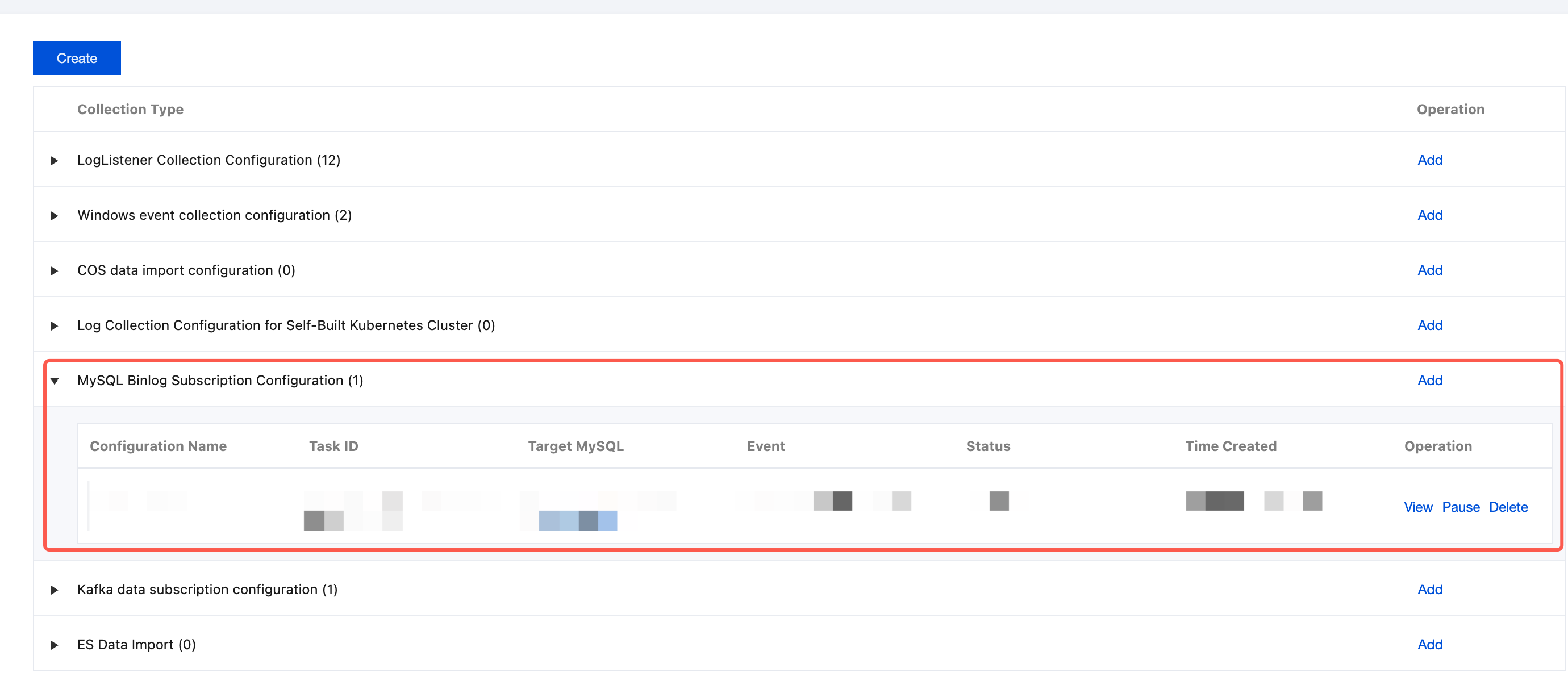 Database Table Blocklist | No | When this option is enabled, the binlogs of specified databases and tables can be ignored and are not collected. Multiple blocklists can be configured, each requiring the following information: Database name: name of the database associated with the binlog to be ignored. Database table: name of the database table associated with the binlog to be ignored. Multiple names can be specified. Note: DDL event binlog collection is not subject to blocklist restrictions. |