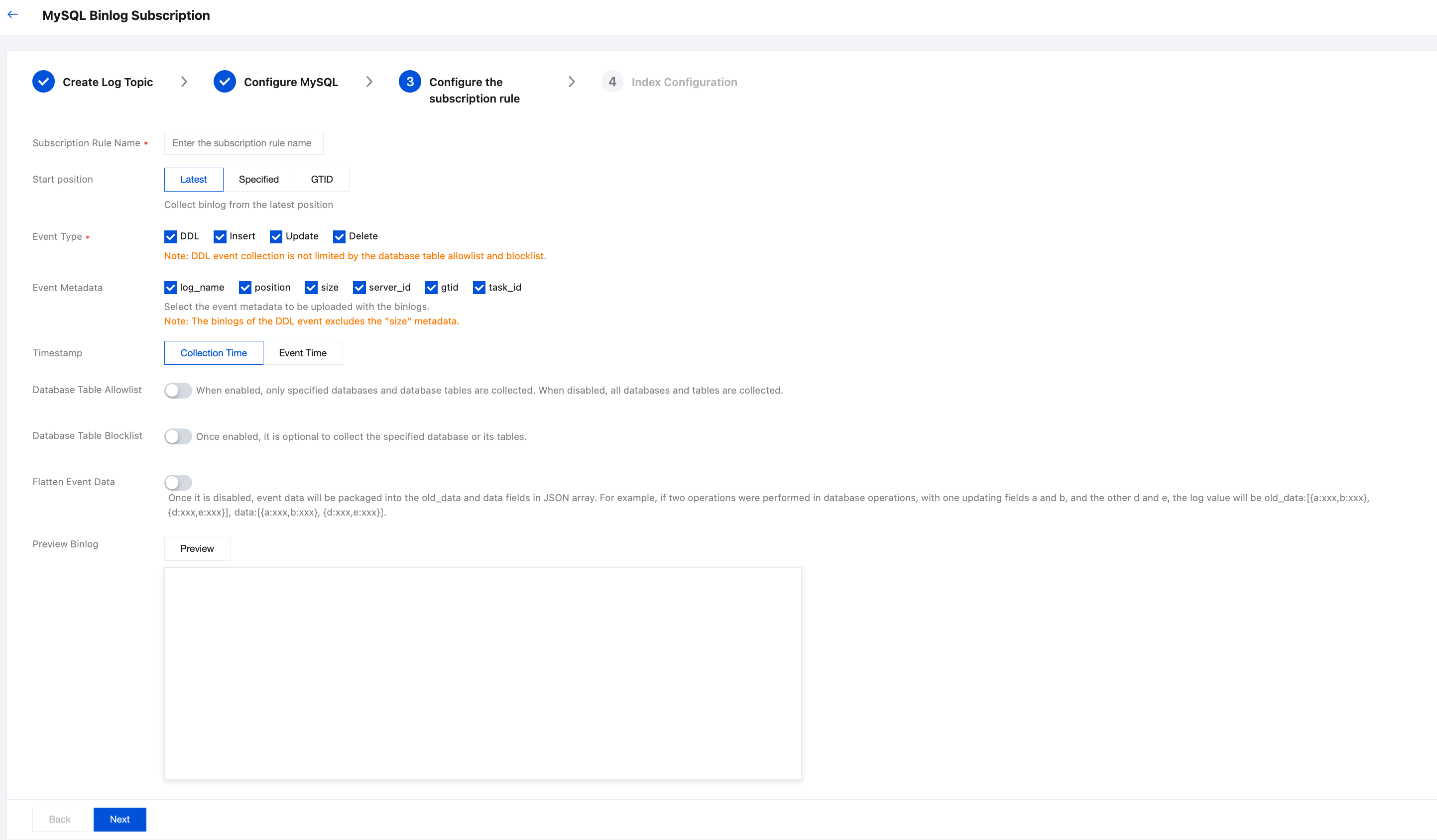 Event Metadata | No | The following 6 types of binlog-related metadata are supported for selection to be uploaded along with the logs: log_name: binlog file name position: starting index of the binlog entry in the binlog file size: binlog size server_id: secondary server ID gtid: transaction ID task_id: current subscription task ID Note: Binlogs for DDL events do not support size metadata. |
