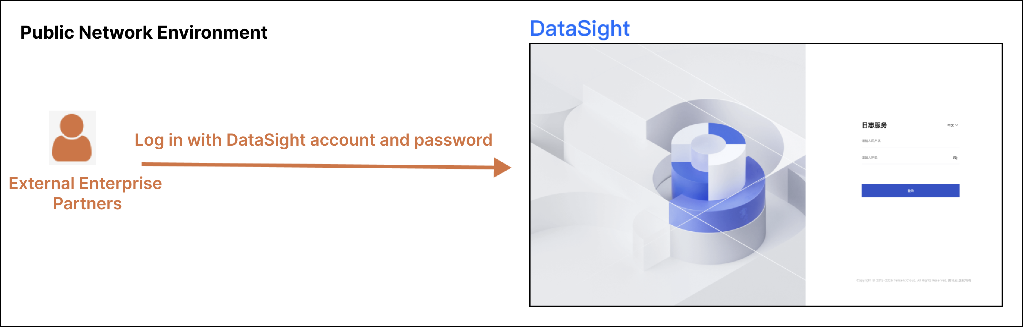 Intranet | Prerequisite: The user's office network must be interconnected with Tencent Cloud via a secure connection, such as a dedicated connection or a VPN tunnel. This method allows access to DataSight from the Tencent Cloud private network for log viewing and analysis. Access from the Internet is not available, thus providing enhanced security. Multiple login methods are supported, including password authentication login and anonymous login. |