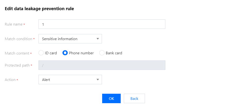 Sensitive information | Identity card/mobile/bank card numbers | Alert, Replace all, Show the last 4 digits, Show the first 4 digits, and Block |