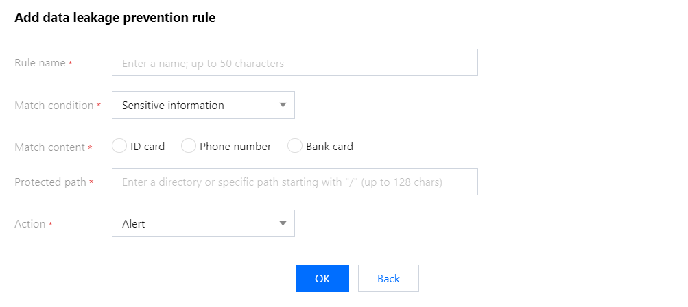 Rule name: Leakage protection rule name of up to 50 characters. You can search for rules by name in attack logs.