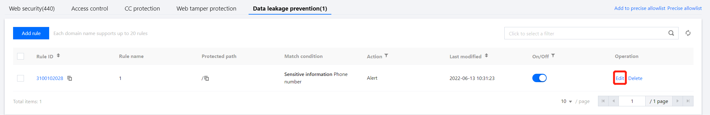 1. On the basic security page, select the target domain name in the top-left corner and click Data leakage prevention. 2. On the page displayed, select the target rule, click Edit in the Operation column, and the rule editing window will pop up.