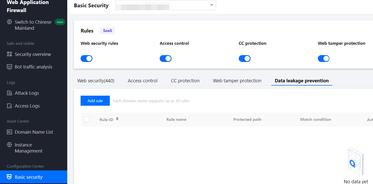 1. Log in to the WAF console and select Configuration Center > Basic Security on the left sidebar. 2. On the basic security page, select the target domain name in the top-left corner and click Data leakage prevention.