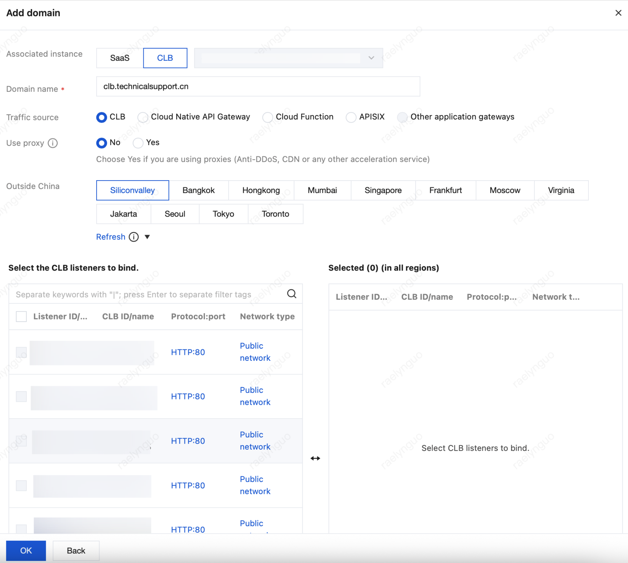 Domain name: Enter the domain name to be protected, such as clb.technicalsupport.cn.
