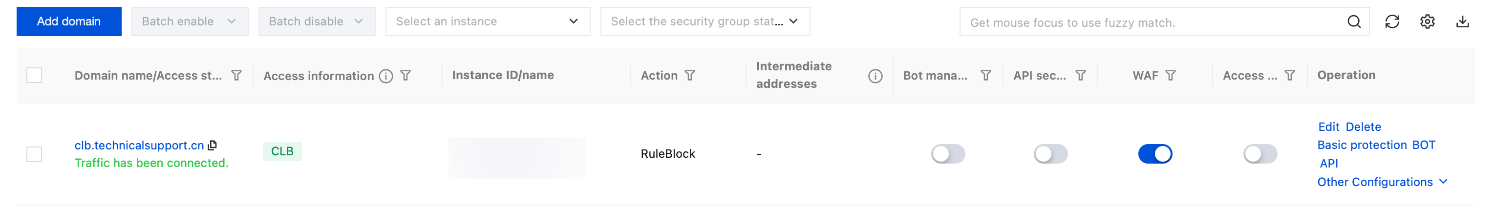 3. Click OK to return to the domain name list, where you can view the protected domain name clb.technicalsupport.cn and the ID, name, Action, and other information of the CLB instance.