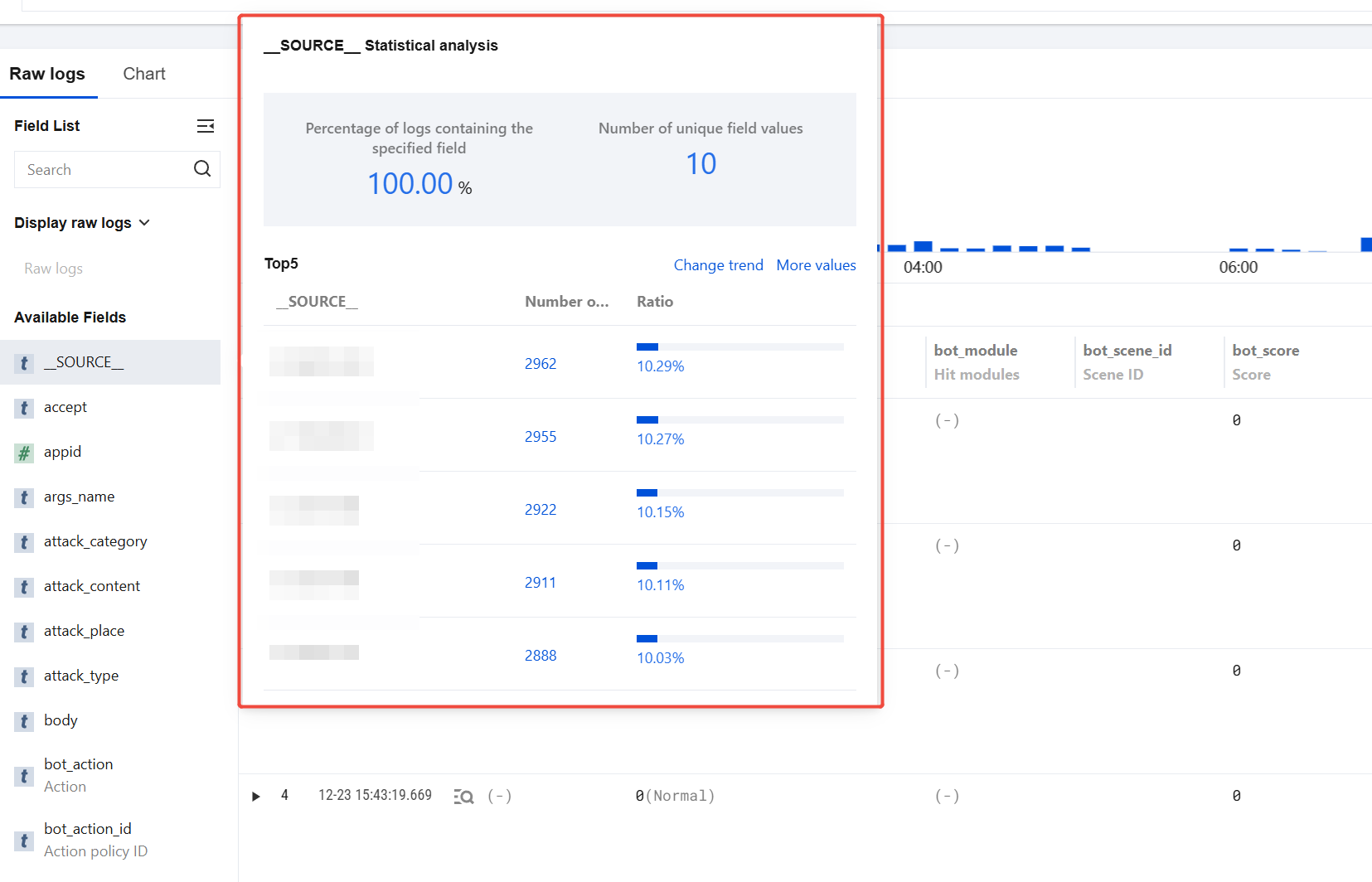 On the left of the raw log data list, click "field name" to display the TOP 5 matching field details sorted by number of logs, along with their percentage of logs. For log details field descriptions, see Field Descriptions for Log Details.