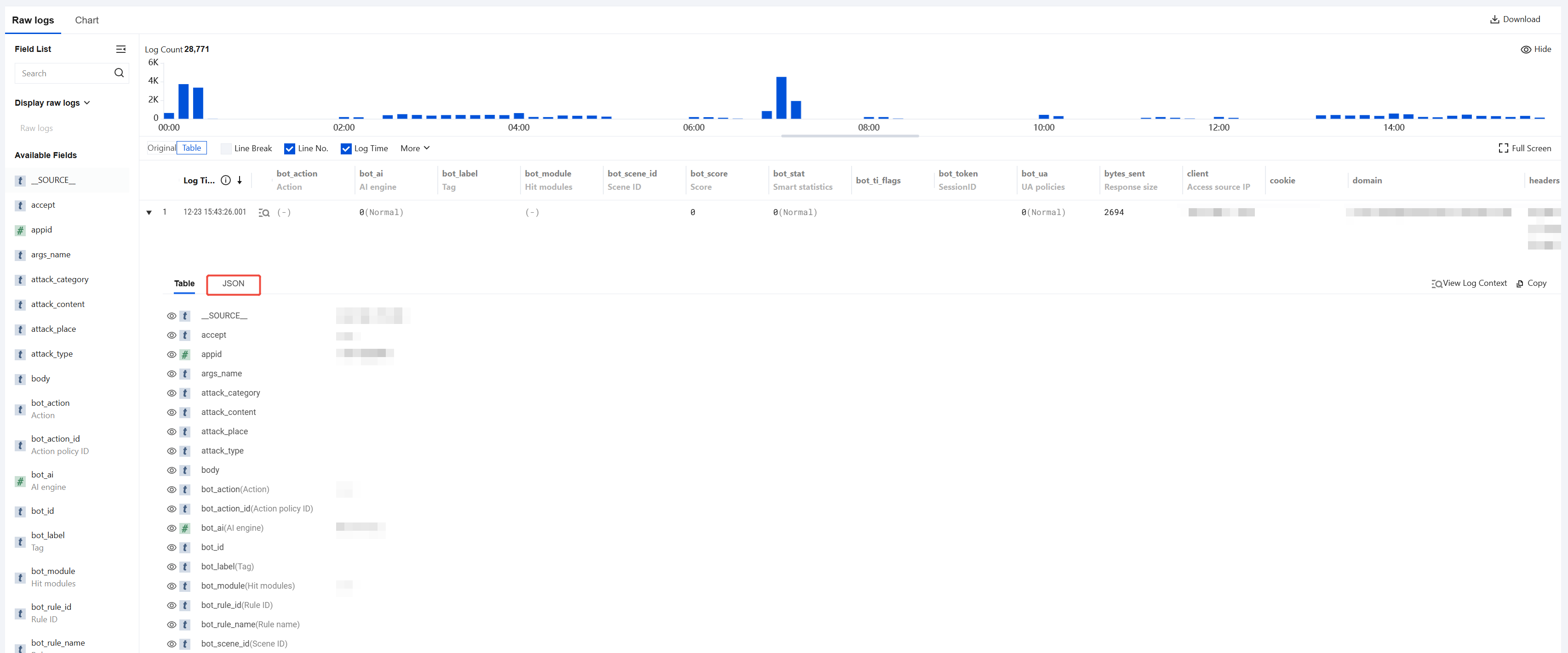 In the access logs data list, click to the left of the occurrence time of each displayed log to view field details; click JSON to view field details in JSON format. For log details field descriptions, see Field Descriptions for Log Details. Chart