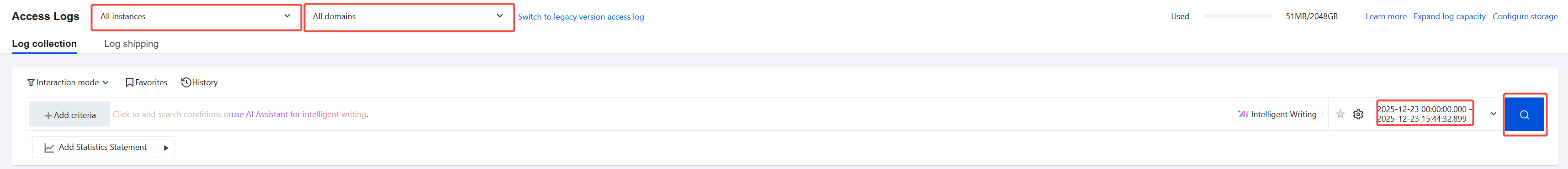 3. Before searching access logs, please first set the search scope. Select the instance and domain, set the time range, and click . Interactive mode: Access Logs are searched based on interaction criteria.