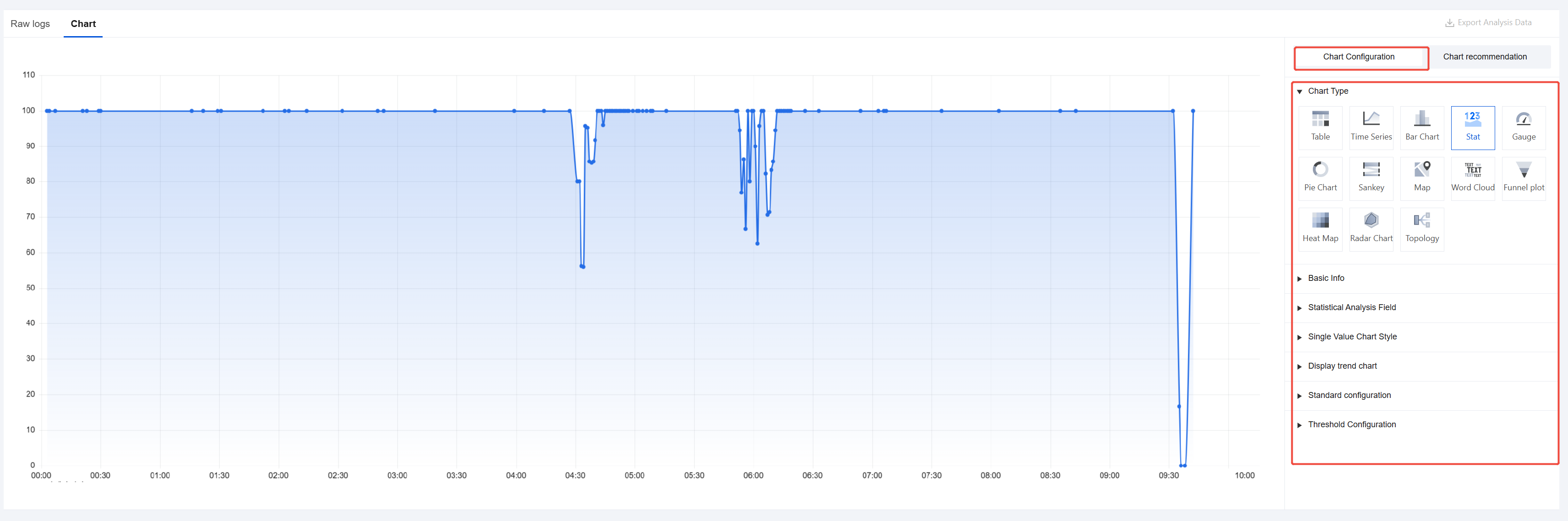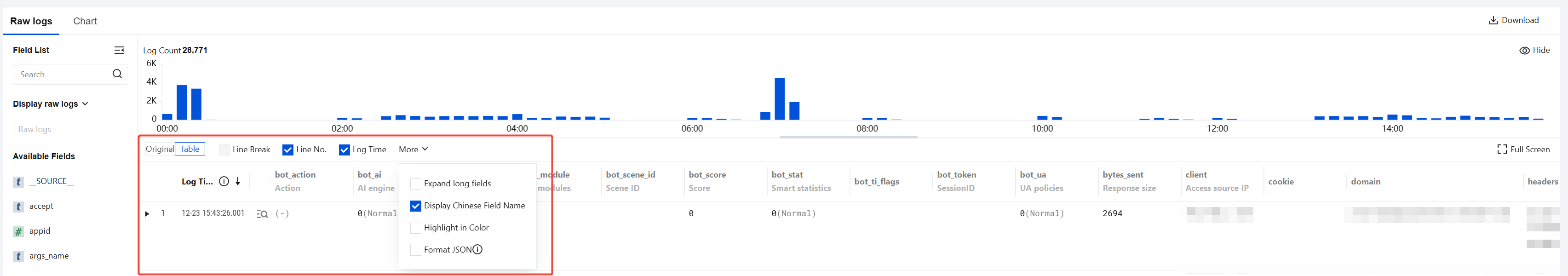 Above the raw logs, you can view key information such as the total number of logs matching the current search conditions and their time distribution. You can also change the display style of raw logs using the settings panel below.