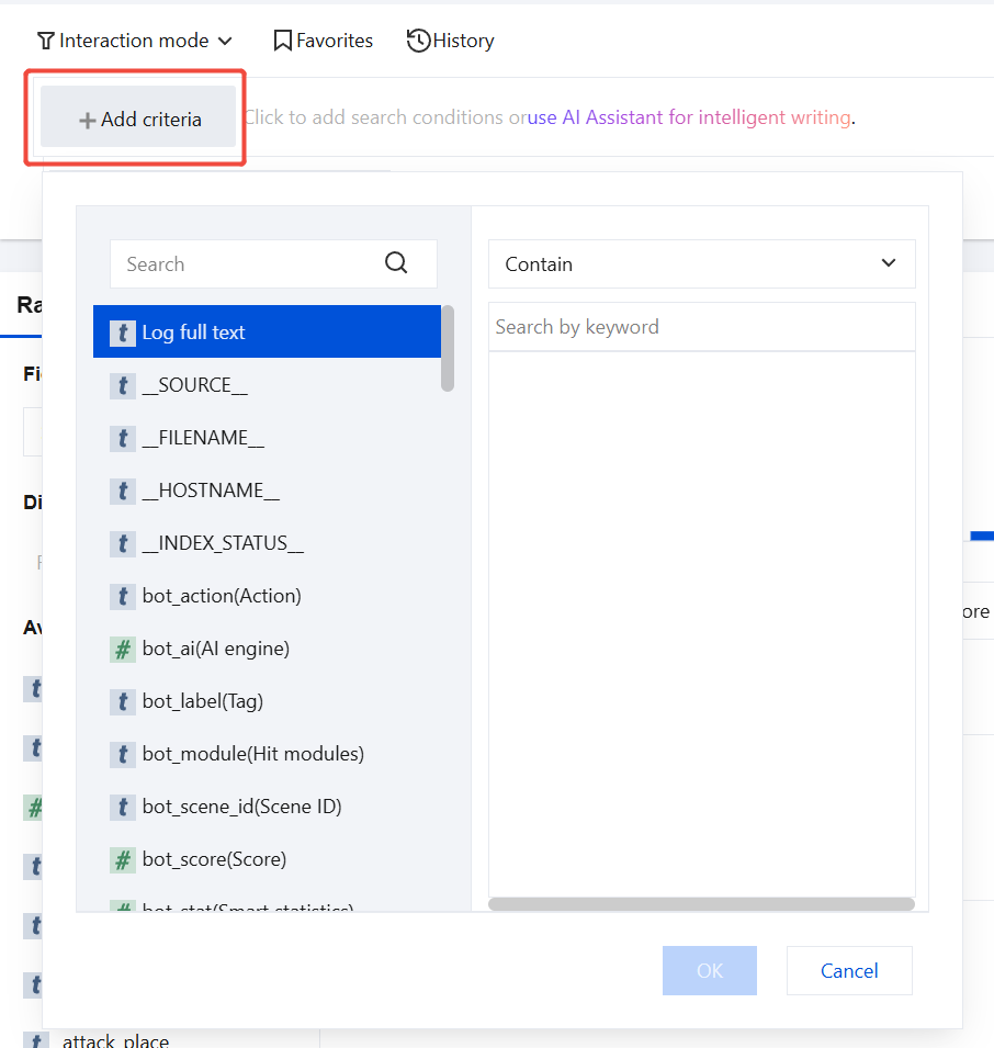 3.1.2 Click Add Search Condition, select fields of log details and logical relations, then click OK. For descriptions of log details fields, see Field Descriptions for Log Details. 3.1.3 Repeat the previous step until all search conditions are added, then click . Statement mode: Search access logs based on search statements.