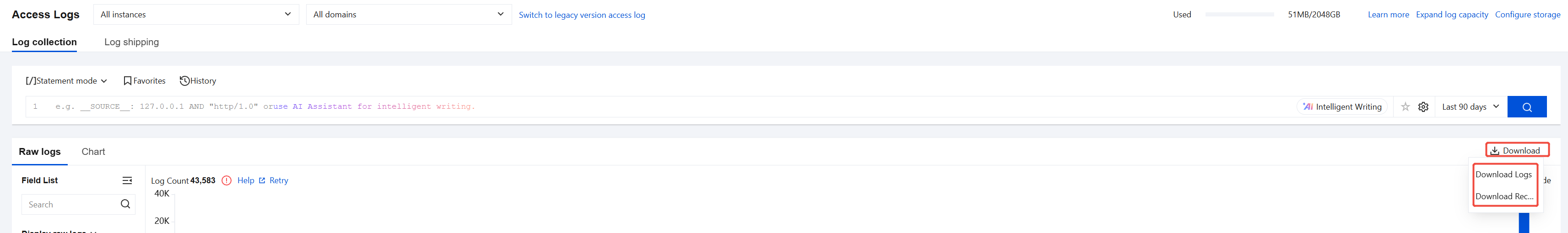 When a wildcard domain (such as: *.abc.com) is selected, logs from all associated subdomains (ending with .abc.com) will also be downloaded.